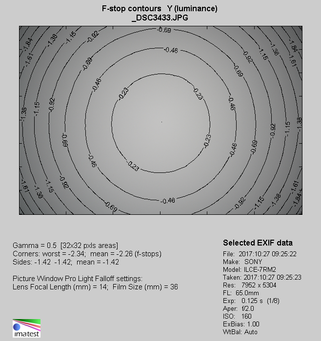 At the maximum relative aperture in the very corners of the frame you lose over half of light - the actual result is 54% (−2.26 EV). The light fall-off problem still remains bothersome by f/2.8 where it reaches 34% (−1.19 EV). You can start talking about moderate values by f/4.0 and f/5.6, where we got the following results: 25% (−0.83 EV) and 20% (−0.66 EV) respectively.