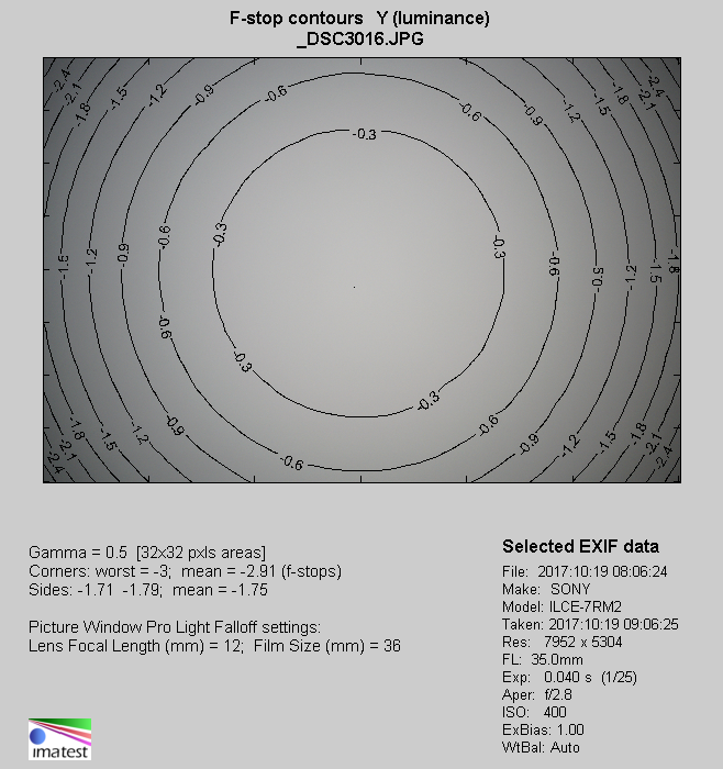 Below we present averaged out values of brightness loss shown in concentric circles as you move further away from the frame centre. The numerical value for every image, expressed in percents, shows the area limited from the top and right by 100% and from the bottom by the presented curve. The area indicates how much light overall is lost due to the vignetting effect. Please don’t mix these percentages with the values given at the beginning of the chapter because they aren’t directly connected.