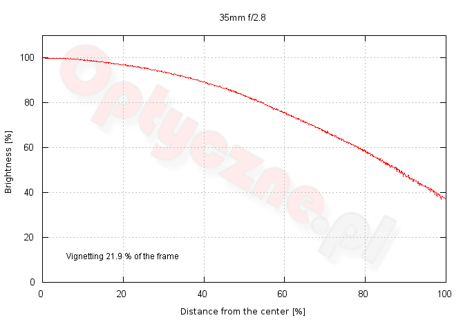 At this place, nothing to worry. The vignetting is noticeable at the maximum relative aperture, reaching 29% (-0.98 EV) but already by f/4.0 and f/5.6 the problems become less pronounced, with the following results: 17% (-0.52 EV) and 13% (-0.41 EV) respectively.