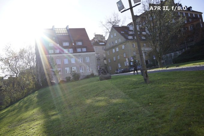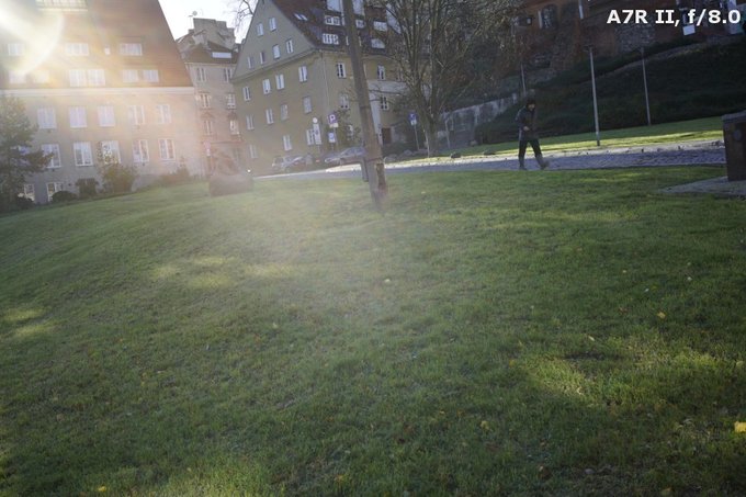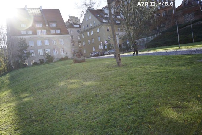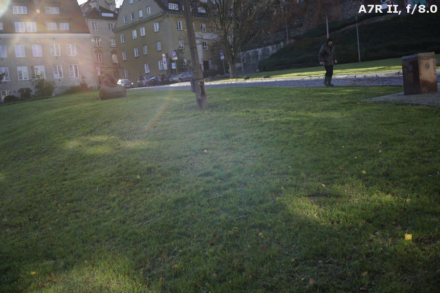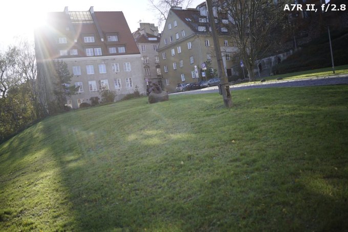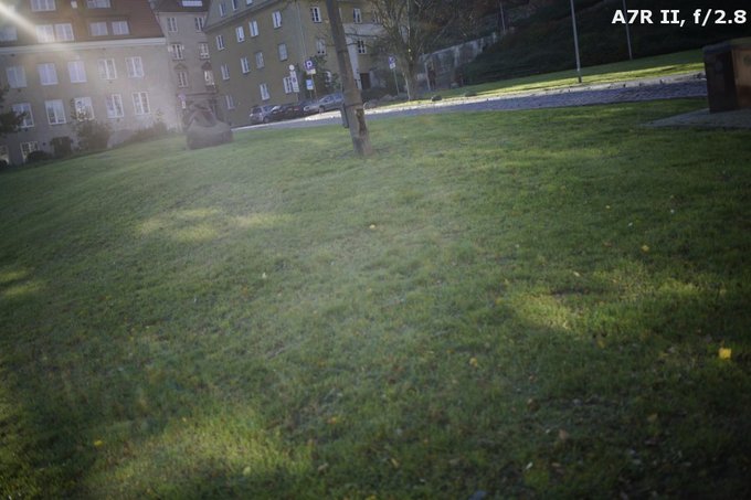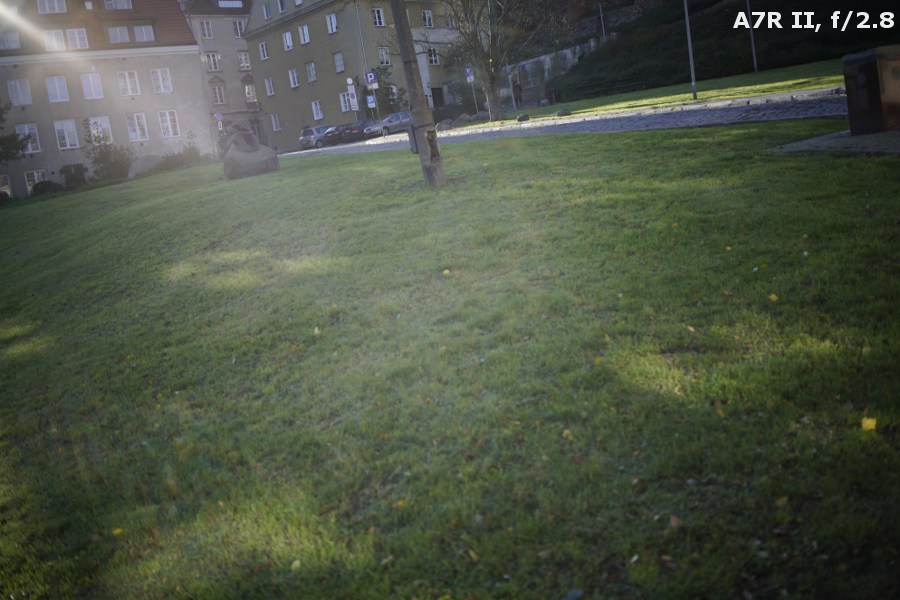 The performance against bright light of the Samyang 2.8/35 is just average. There are no serious problems or huge slip-ups but the situation remains far from perfect. You see ghosting and flares of various types for different combination of sun position and aperture values but you can rarely find a situation when a whole shot is spoiled by these effects completely.