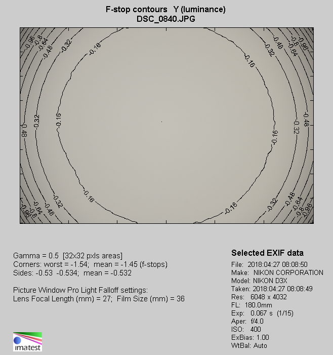 In the case of the 180 mm focal length and the maximum relative aperture you don’t have any problems with noticing brightness loss as it amounts to 39% (−1.45 EV). That aberration decreases on stopping down so by f/5.6 you deal with a moderate level of 24% (−0.79 EV), and by f/8.0 you see a value of 15% (−0.46 EV). The aberration becomes imperceptible by f/11 and f/16, where it reaches respectively 11% (−0.33 EV) and 6% (−0.19 EV).