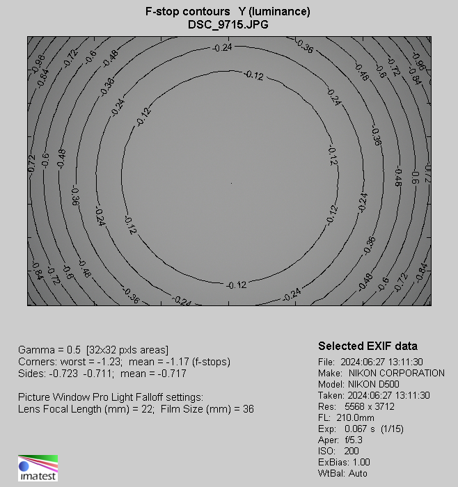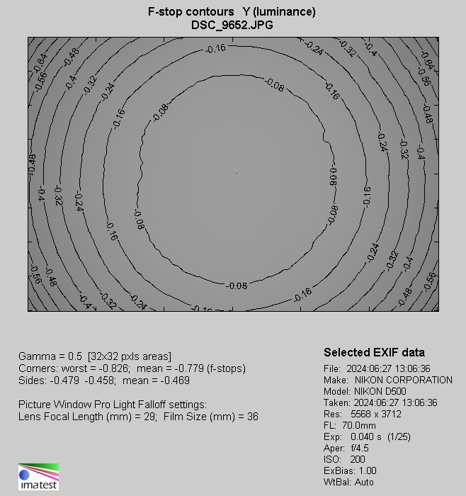 A combination of 70 mm and f/4.5 aperture means that you’ll lose 24% (−0.78 EV) of light in frame corners (−0.78 EV). It is a moderate result. Problems end by f/5.6 and f/8.0 where we got respectively 17% (−0.52 EV) and 7% (−0.20 EV).