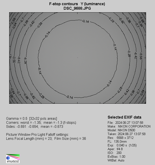It is a bit easier to notice vignetting at the 135 mm focal length. In its case by f/4.8 the brightness loss in frame corners amounts to 36% (−1.30 EV) and then decreases to 33% (−1.16 EV) on stopping down to f/5.6. By f/8.0 the vignetting is 18% (−0.58 EV), and then by f/11 it decreases to an imperceptible value of 8% (−0.24 EV).