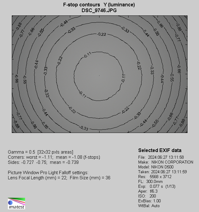 At 300 mm focal length and by f/6.3 aperture the aberration level is 31% (−1.08 EV). On stopping down the aperture to f/8.0 it decreases to 22% (−0.72 EV). By f/11 the problem becomes marginal as the official result we got amounted to just 9% (−0.27 EV).