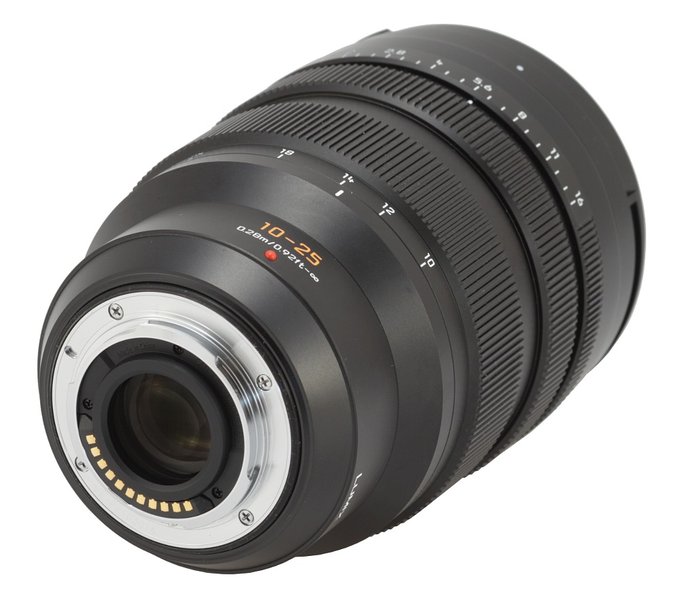 The next part is a zoom ring, 27 mm wide. Most of its surface is covered by metal ribbing and below you can find focal length markings at 10, 12, 14, 18, and 25 mm. The mechanism moves smoothly and is well damped across the range.