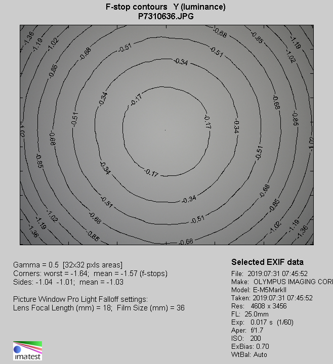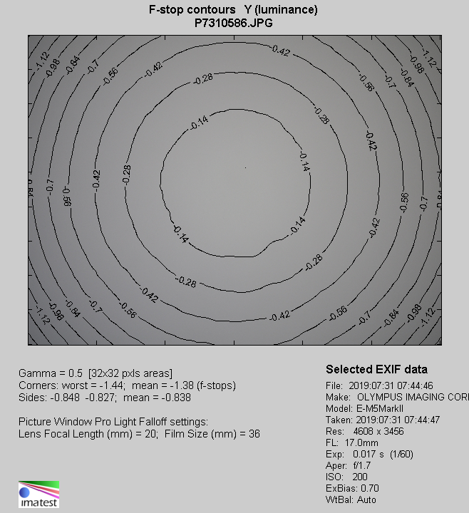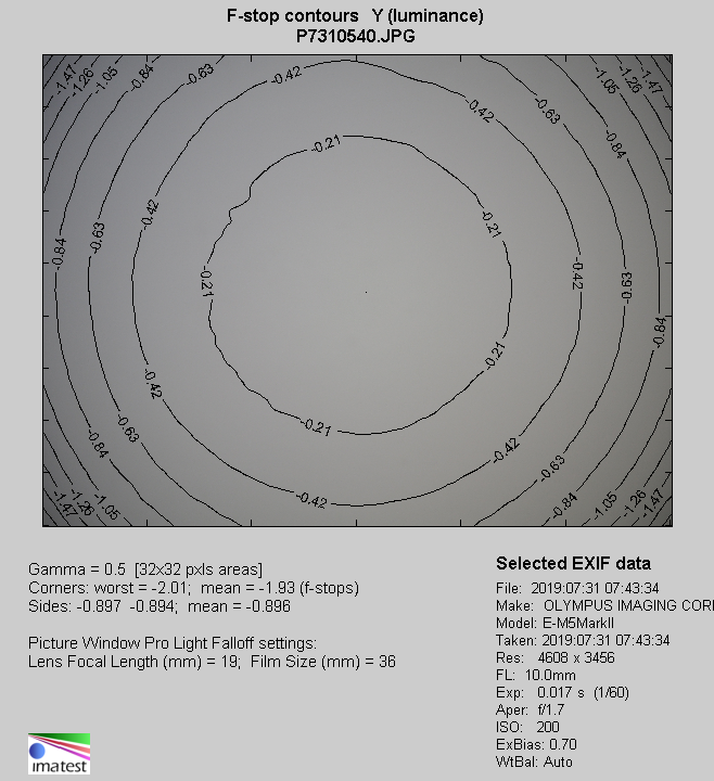 For a very difficult combination of f/1.7 aperture and wide angle of view at 10 mm the brightness loss in frame corners amounts to 49% (−1.93 EV). It is a significant value but with these parameters it would be foolish to expect anything distinctly better.