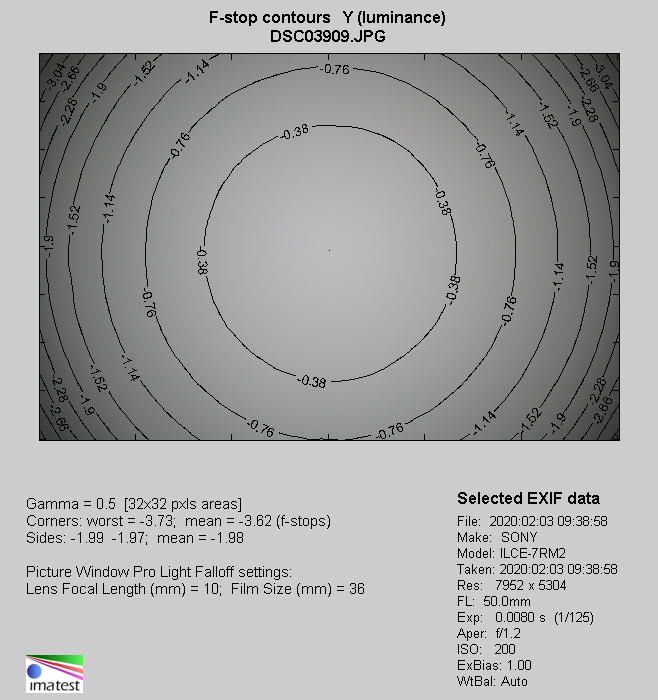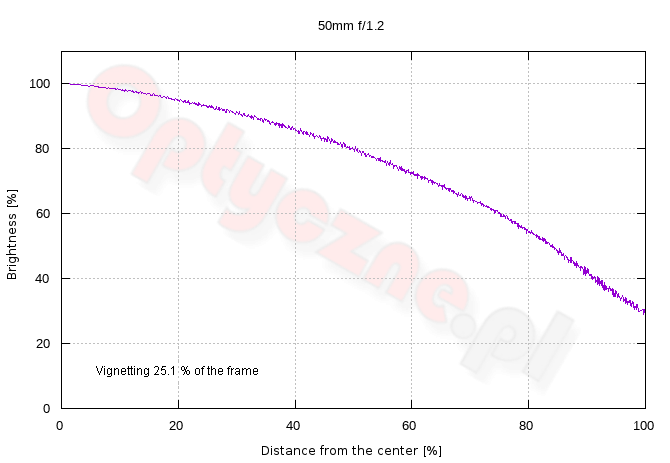 Light fall-off in frame corners are huge- by f/1.2 they amount to 71% (−3.62 EV), and by f/1.4 to as much as 67% (−3.22 EV). Such results are really weak. What's more, even by f/2.0 vignetting remains quite distinct, being 48% (−1.92 EV). A lot of reservations you can express concerning the performance by f/2.8 where brightness loss in frame corners reaches 37% (−1.33 EV). Unfortunately further stopping down the aperture influences this aberration rather weakly: by f/4.0 it reaches 31% (−1.06 EV), and by f/5.6 it gets to 26% (−0.87 EV). After employing f/8.0 and f/11.0 you don't see any changes in vignetting values.