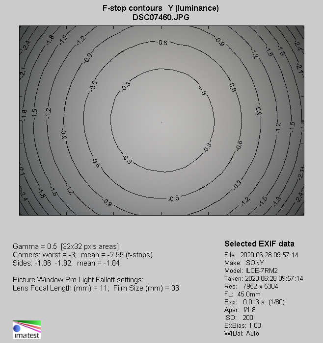 According to our expectations there are far more problems here. At the maximum relative aperture brightness loss in frame corners amounts to as much as 64% (−2.99 EV). You can also spot vignetting without any difficulties by f/2.0 and f/2.8 where we got the following results: 60% (−2.68 EV) and 36% (−1.30 EV). Moderate levels are achieved only from f/4.0 onwards, with light fall-off being 27% (−0.92 EV). By f/5.6 the vignetting decreases to 23% (−0.76 EV) and further stopping down doesn't have any measurable influence on this aberration.
