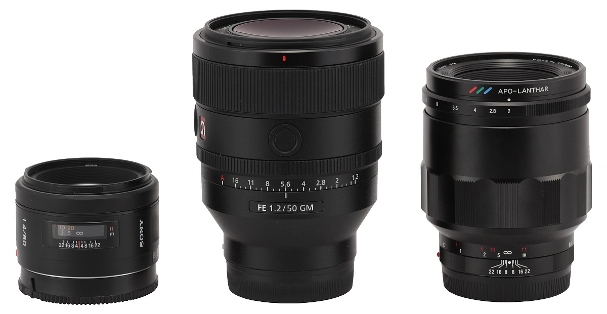 In the photo below the Sony FE 50 mm f/1.2 GM is positioned between the classic gauss 50 mm lens designed for reflex cameras, namely the Sony A 50 mm f/1.4, and the Voigtlander Apo-Lanthar 2/65.