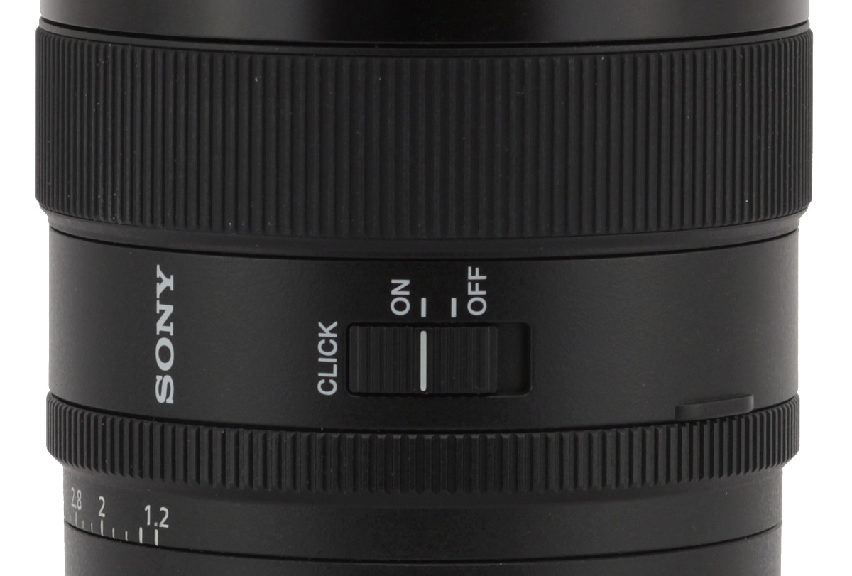Another immobile ring features the Sony logo, the G series mark, a CLICK ON/OFF toggle that allows you to control the aperture ring, and a focusing mechanism mode switch AF/MF. You also get two aperture lock buttons which, additionally, can be programmed from the camera menu level.