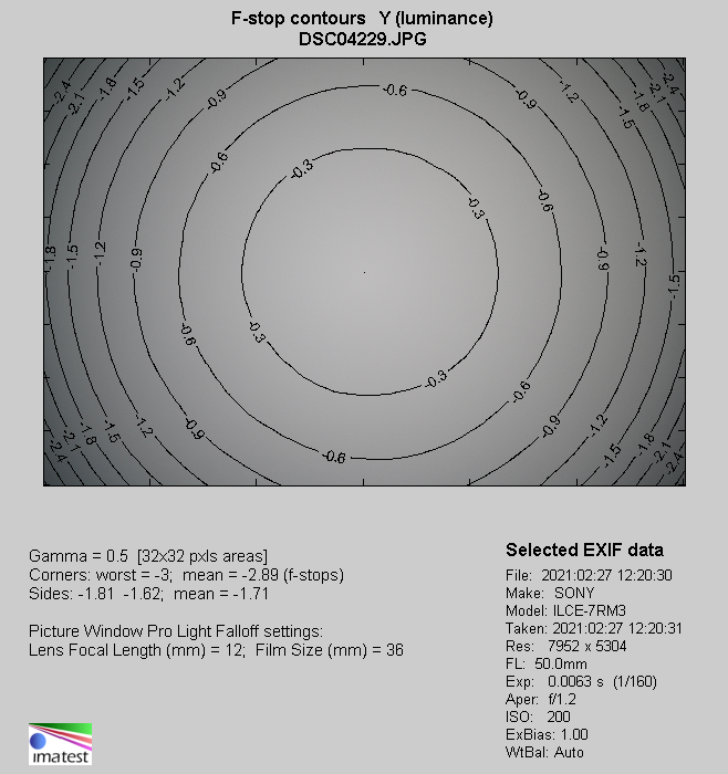 At the maximum relative aperture the loss of light is really huge, reaching as much as 63% (−2.89 EV). Still I have to admit that, taking the dimensions of the lens and its excellent aperture into account, I expected vignetting higher than 3 EV. The fact that our measurements produced a value below that level I consider a pleasant surpirse. It's enough you remind yourself of a performance of the Voigtlander Nokton 50 mm f/1.2, which vignetting amounted to 71%.