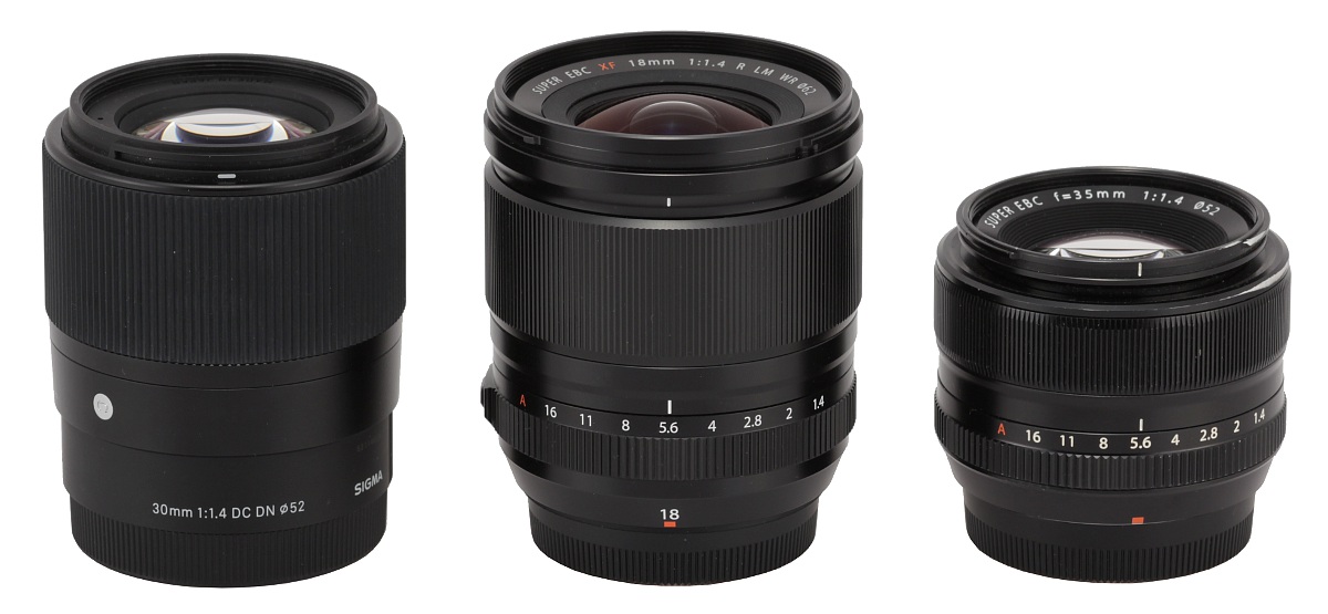 In the photo below you can notice the significant bulk of the Fujinon as we positioned it between the Sigma C 30 mm f/1.4 DG DN, also designed for APS-C sensors, and its system buddy, the Fujinon XF 35 mm f/1.4R.