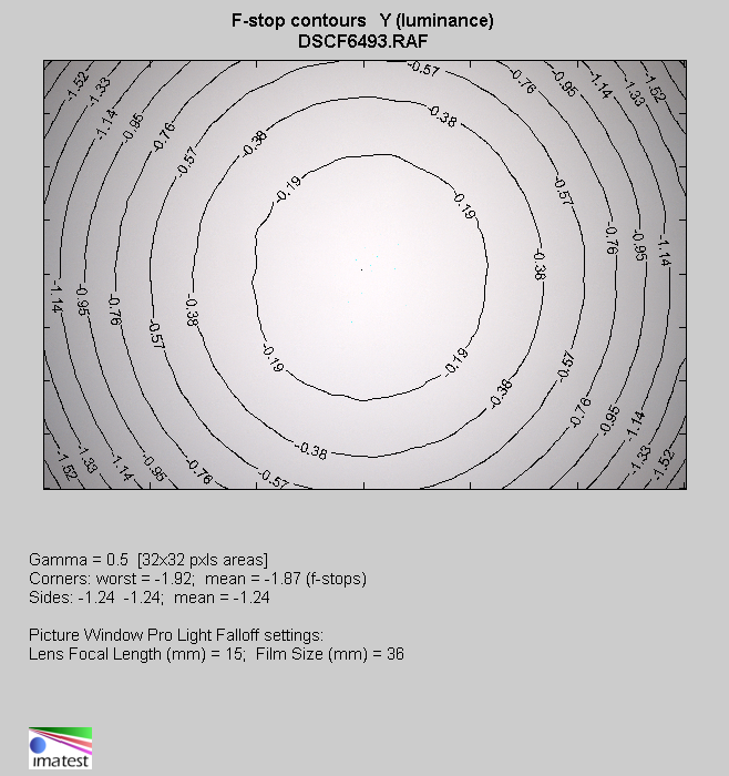 Only while examining RAW files you can see the real level of this aberration. At the maximum relative aperture it amounts to 48% (-1.87 EV). It's a high value but, if you take into account the aperture fastness and angle of view, you can say the Fujinon still managed to emerge unscathed. Especially that by f/2.0 vignetting decreases to 38% (-1.18 EV), by f/2.8 it drops to 26% (-0.86 EV), and by f/4.0 it is diminished even a bit more, to 25% (-0.85 EV). Further stopping down doesn't have any measureable influence on the aberration described here.