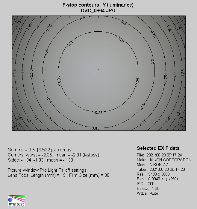 At the maximum relative aperture brightness loss in frame corners reaches a level of 55% (-2.31 EV). It is a significant value but still acceptable, especially if you take into account the aperture fastness of the Argus. By f/1.1 vignetting decreases to 50% (-2.02 EV), and by f/1.4 it drops even further to 37% (-1.33 EV). By f/2.0 and f/2.8 you deal with a bit more moderate vignetting levels, with results of 27% (-0.91 EV), and 22% (-0.71 EV) respectively. Problems end by f/4.0, f/5.6, and f/8.0, where brightness loss levels are, respectively: 18% (-0.57 EV), 13% (-0.40 EV), and 12% (-0.38 EV).
