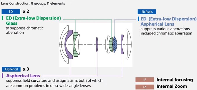 As you can notice, the Sony 10-20 mm is physically the lightest and almost the smallest. Only the Canon 11-22 mm can compete with it in this area; its zoom ratio also amounts to 2 but it is easier to manufacture for three reasons: first, it is slower, second, its angle of view is narrower, third, it is designed for a tad smaller detector.
