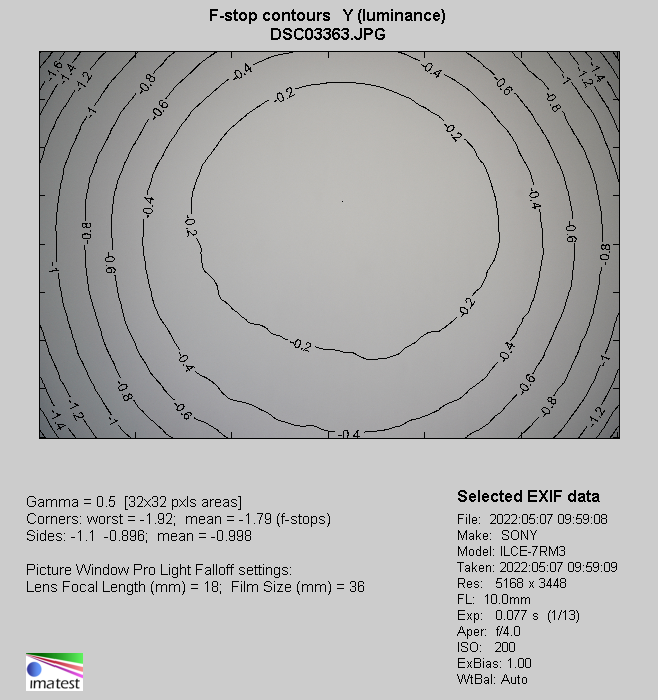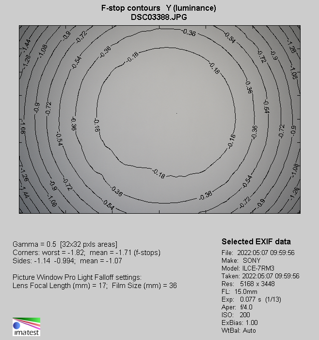 At the shortest focal length the results are distinctly higher. By f/4.0 brightness loss in frame corners reaches as much as 59% (−2.57 EV), and on stopping down to f/5.6 it decreases to 50% (−1.98 EV). By f/8.0 and f/11.0 we got 42% (−1.56 EV) and 38% (−1.38 EV) respectively. When you reduce the aperture to f/16.0 you see another decrease, this time to a level of 35% (−1.25 EV).