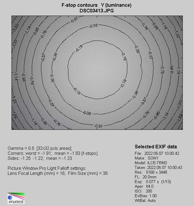 When you pass to the 20 mm focal length the situation doesn't change almost at all. By f/4.0 light fall-off in the frame corners reaches 47% (−1.83 EV) and it is decreased to 34% (−1.19 EV) on stopping down the aperture to f/5.6. By f/8.0 and f/11.0 we got, respectively, the following results: 28% (−0.93 EV) and 25% (−0.83 EV).