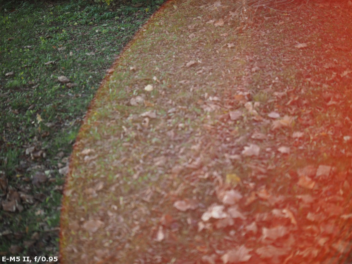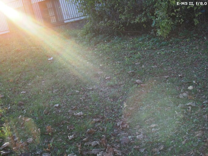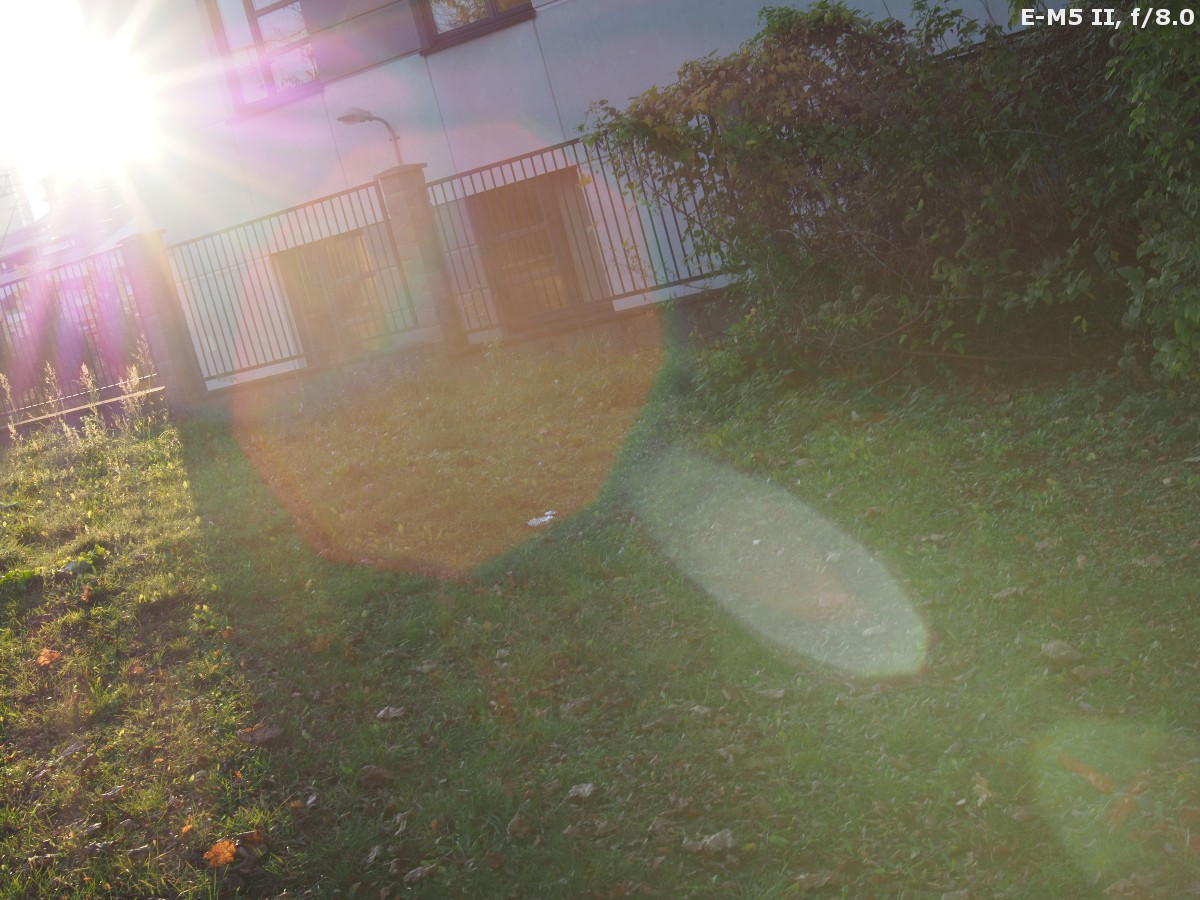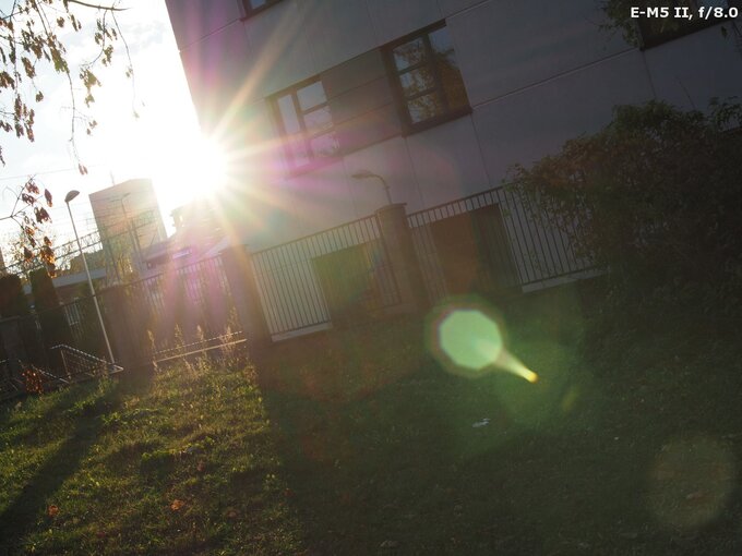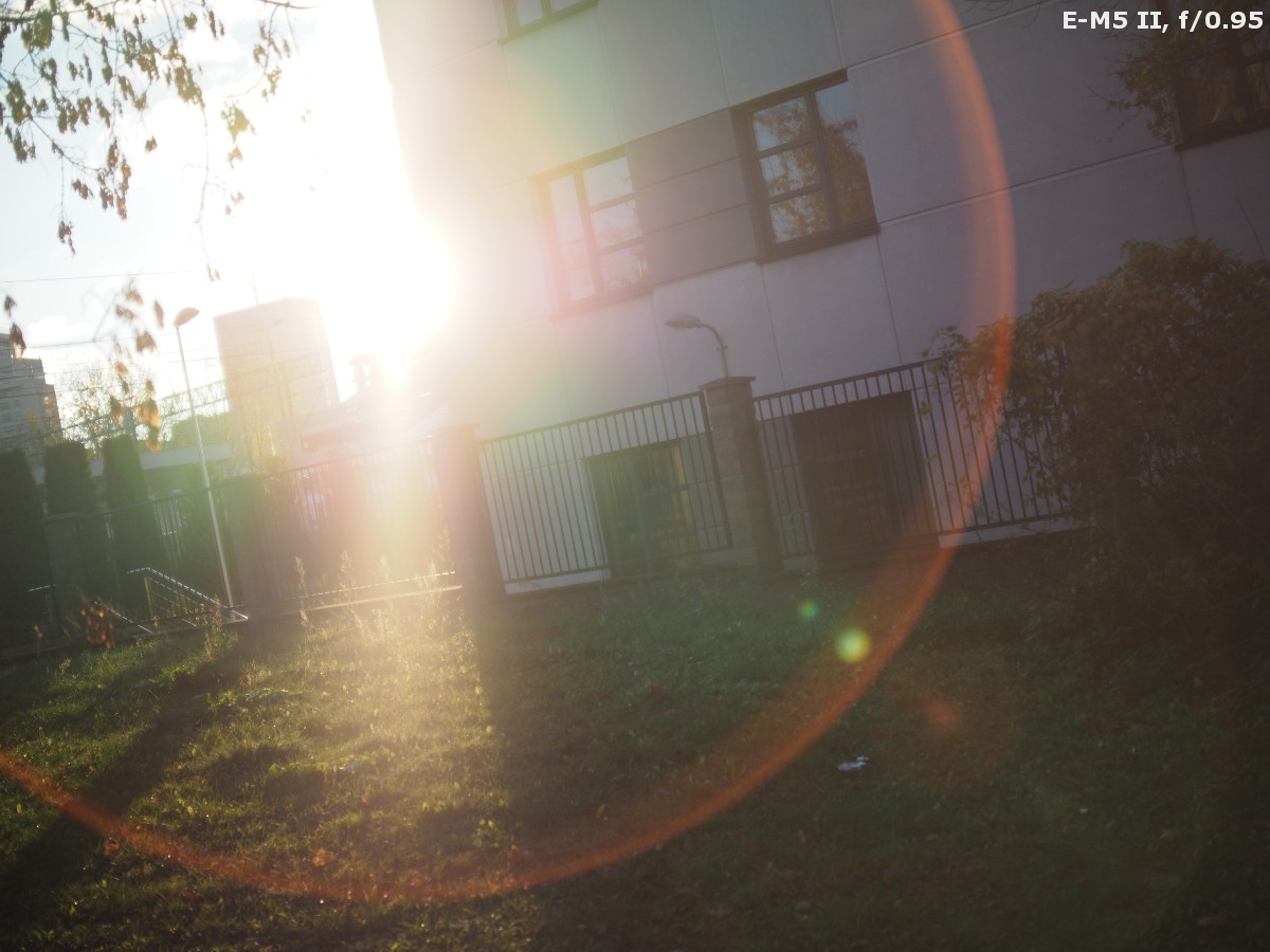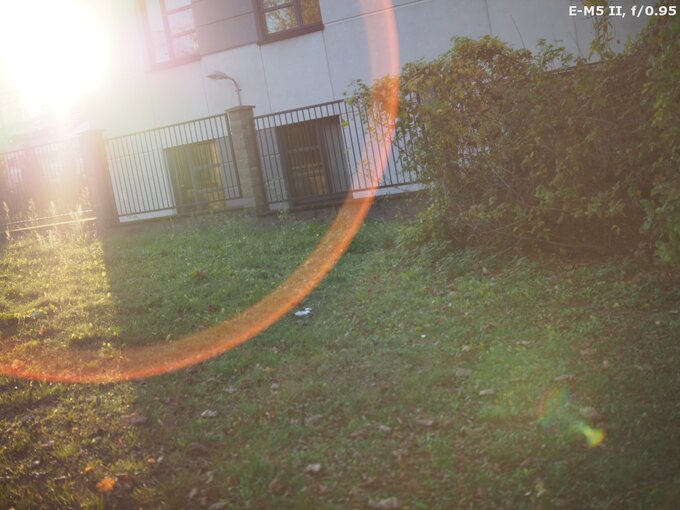 The performance against bright light of the Argus 25 mm f/0.95 MFT is simply abysmal. I rarely see such a situation: while taking photos of grass before my feet with a standard lens I was able to catch nasty flares. With the Argus such an effect can be produced without any problems. What's more, the variations of colour, intensity, and size of different light artifacts are endless – it's enough you change the aperture or move the sun inside the frame or far away from its corner and you can enjoy images almost like from a toy kaleidoscope, full of colours and different light effects...