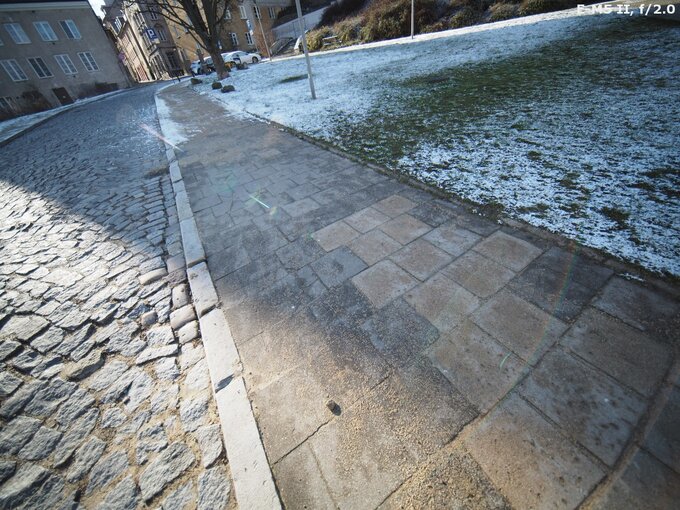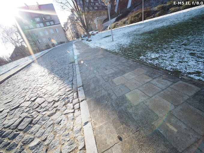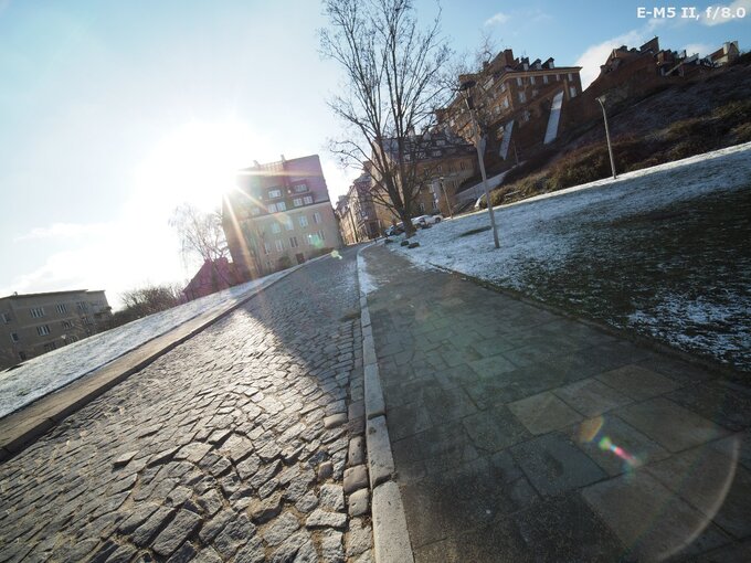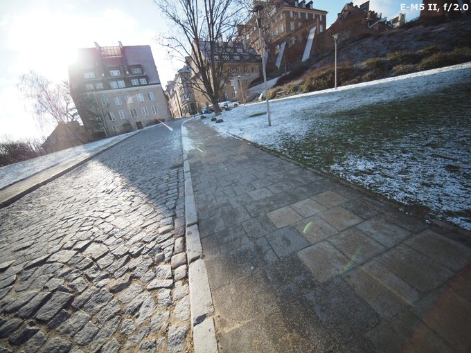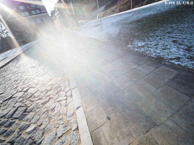 After stopping down the aperture vignetting decreases and flares start being bothersome. What's more, they can be noticed in many different situations, independent of the position of the sun. However, there is one position you should avoid - if you put the sun right behind the frame corner you can produce a really nasty flare that takes up the most of your photo.