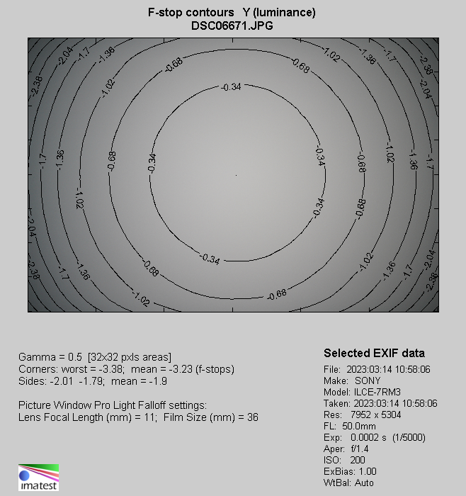 Especially that the vignetting problem remains acute even on stopping down. By f/2.0 we got a result of 50% (−2.02 EV), and by f/2.8 it is still 45% (−1.75 EV).Also by f/4.0 and f/5.6 you won't have the slightest problem with noticing brightness loss in the frame corners, as it amounts to, respectively, 41% (−1.53 EV) and 36% (−1.29 EV). Even applying f/8.0 and f/11.0 doesn't guarantee you get rid of vignetting completely, as this aberration still reaches 33% (−1.16 EV) and 30% (−1.02 EV).