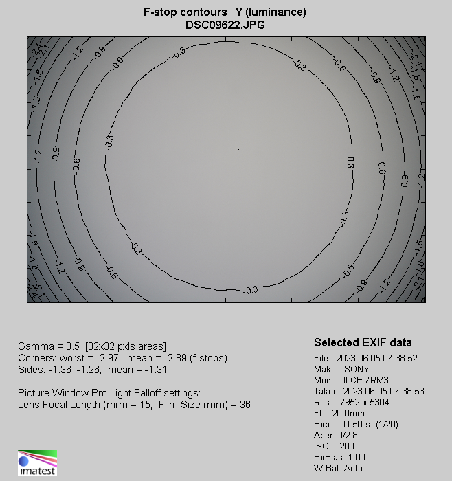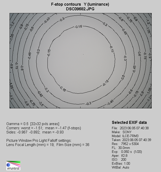 In case of the most difficult combination of the wide angle and maximum relative aperture the loss of light in the frame corners reaches 63% (−2.89 EV); then it decreases to 48% (−1.88 EV) on stopping down the aperture to f/4.0 and to 40% (−1.48 EV) after applying the f/5.6 aperture. By f/8.0, f/11.0 and f/16.0 we got, respectively: 35% (−1.26 EV), 34% (−1.19 EV) and 33% (−1.16 EV).