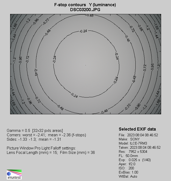 At the maximum relative aperture the Sigma C 2/50 shows vignetting of 56% (-2.36 EV), a result slightly better than 59% reached by the rival Apo Lanthar. By f/2.8 this aberration decreases to 35% (-1.24 EV), and by f/4.0 it drops to 22% (-0.71 EV). By the f/5.6 and f/8.0 apertures we got, respectively, the following values: 15% (-0.46 EV), and 13% (-0.42 EV). Further stopping down of aperture didn't bring any measureable results.