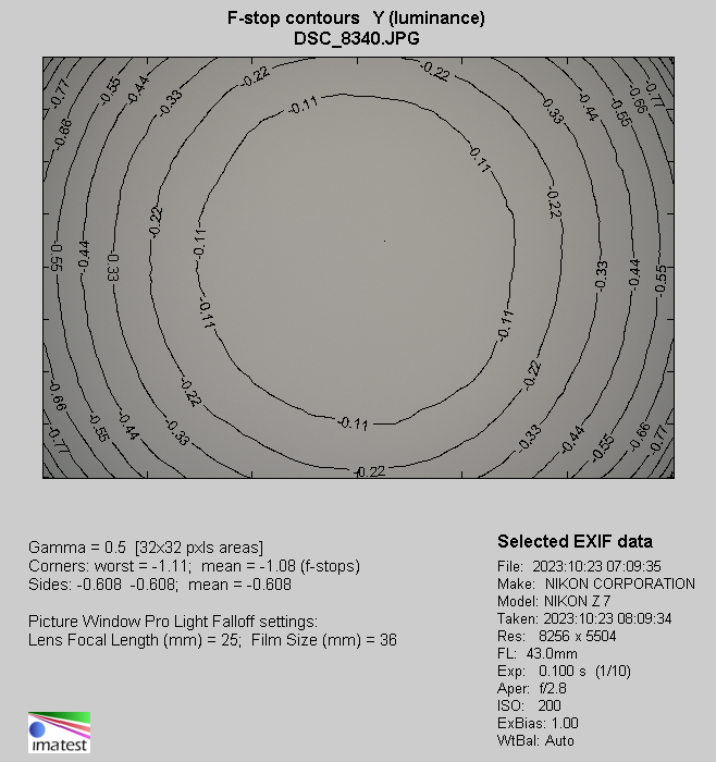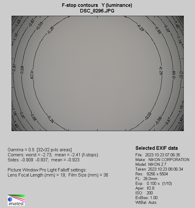 In the Nikon Z7 body it is possible to switch vignetting correction off and we did that exactly for the purposes of our test so the JPEG files presented above aren't automatically corrected. We also were able to switch off distortion correction so vignetting results for JPEG files are, within the measurement error, the same as for RAW files; that's why we are going to describe just one kind of files in our test.