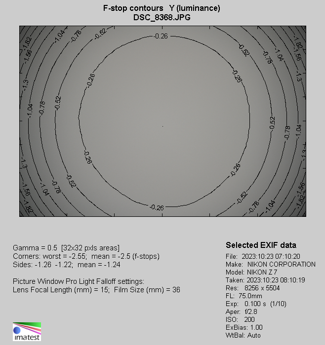 A bit higher results you see at 75 mm where, at the maximum relative aperture, this aberration gets to 17% (−0.54 EV), and by f/4.0 it drops to 4% (−0.13 EV).