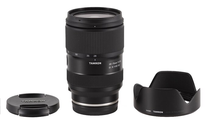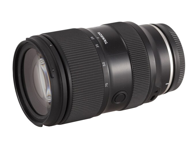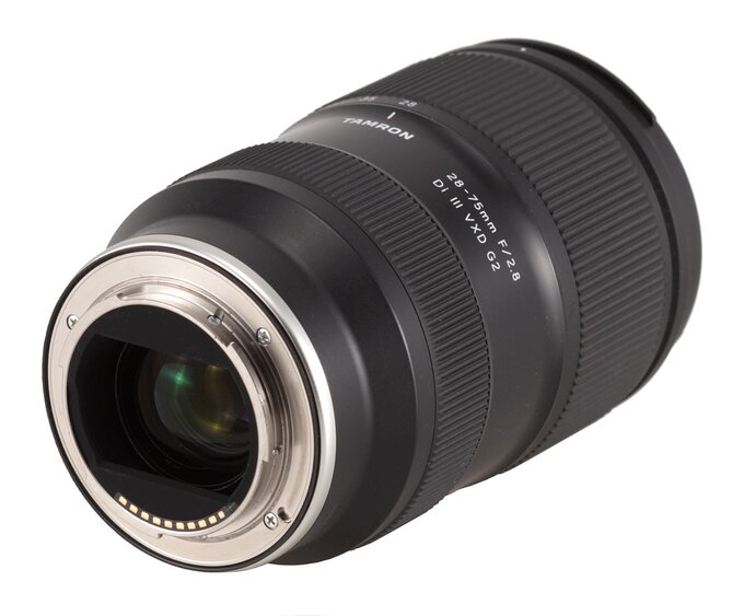 The tested lens starts with a metal mount with contacts and a 36 x 23 mm frame. Inside the frame you find a rear element of the lens, 30 mm in diameter. The element moves and is situated 0.5 cm deep inside that frame at the focal length set at 28 mm; after passing to 75 mm it hides about 2.5 cm deep, revealing a black, well-matted inner tube and some electronic parts. Of course it means you can't speak here about a fully sealed barrel or perfect blackening of the inside.