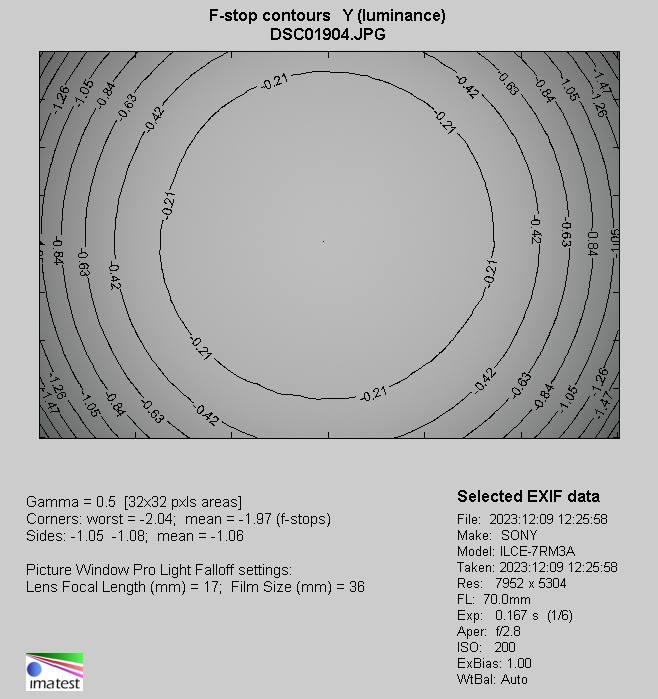 At the combination of the 70 mm focal length and f/2.8 aperture problems are clearly visible, with vignetting reaching 49% (−1.97 EV). By f/4.0 vignetting decreases to 29% (−1.01 EV), and by f/5.6 it drops further to 13% (−0.42 EV), and by f/8.0 to 9% (−0.26 EV). Further stopping down doesn't produce any measurable effects.