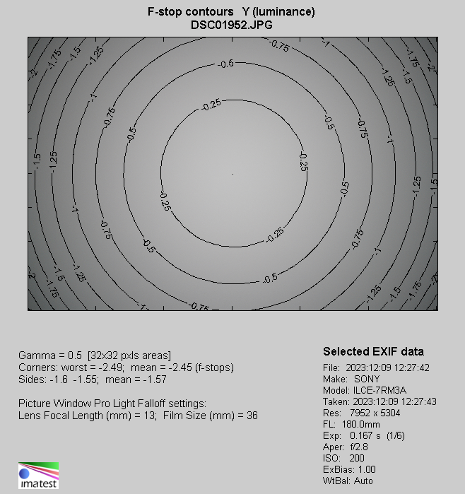 At 180 mm focal length we see similar results to the ones in the middle of the range: at the maximum relative aperture vignetting amounts to 57% (−2.45 EV), by f/4.0 it drops to 37% (−1.34 EV), and by f/5.6 it decreases to 19% (−0.62 EV). By f/8.0 and f/11.0 we got the following results: 11% (−0.35 EV) and 8% (−0.25 EV) respectively.