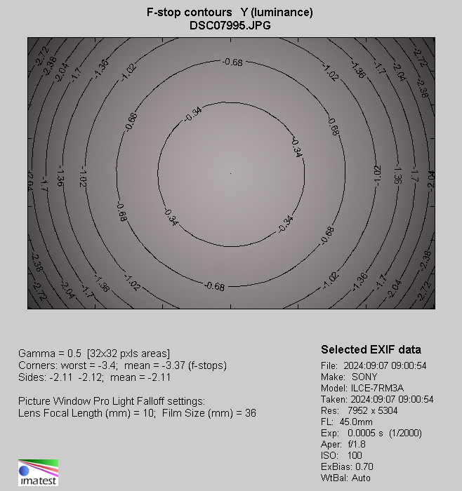 After changing the focal length into 35 mm, the results are very similar. By f/1.8 vignetting is 61% (−2.75 EV), by f/2.0 it reaches 58% (−2.51 EV), and by f/2.8 it drops to 36% (−1.27 EV). By f/4.0 and f/5.6 the problem still remains bothersome because we measured the following values: 24% (−0.80 EV) and 18% (-0.58 EV) respectively. Further stopping down doesn't produce any measurable effects.
