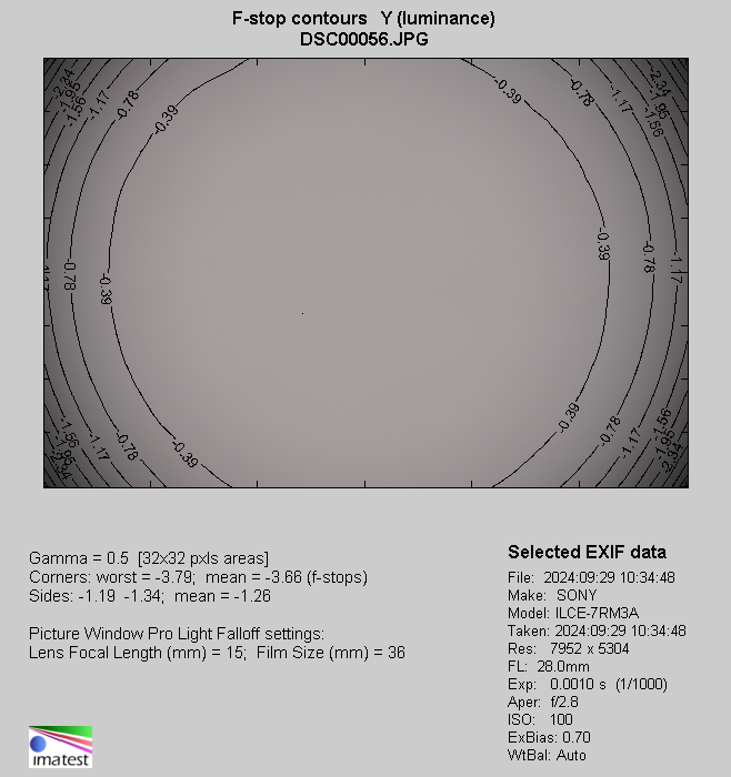 Returning to our measurements on uncorrected JPEG files, by f/4.0 you have to deal with a still high level of 57% (-2.44 EV), by f/5.6 it decreases to 41% (-1.54 EV), and by f/8.0 to 29% (-0.99 EV). Not especially bothersome values are measured only by f/11.0 and f/16.0 apertures, where we got, respectively, 22% (-0.70 EV) and 17% (-0.53 EV).