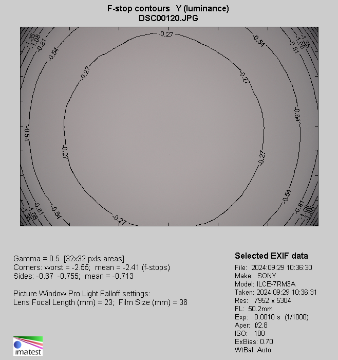 A significant improvement of the performance is visible after passing to the 50 mm focal length. Here, at the maximum relative aperture, vignetting is 57% (-2.41 EV) and it decreases to 38% (-1.37 EV) when you apply f/4.0. This aberration remains noticeable only by f/5.6 where it reaches 21% (-0.70 EV), and then it becomes negligible because by f/8.0 we measured just 13% (-0.39 EV) and it decreases to 11% (-0.35 EV) on stopping down the lens by an additional f-stop.