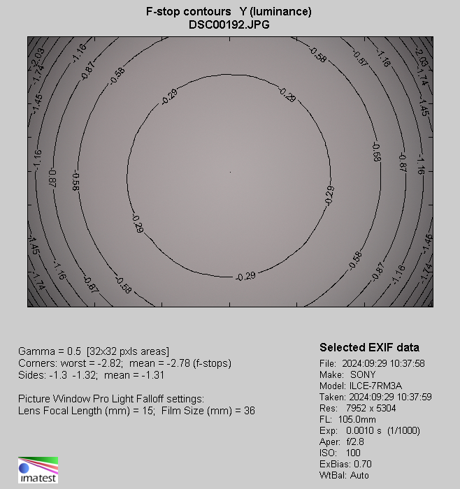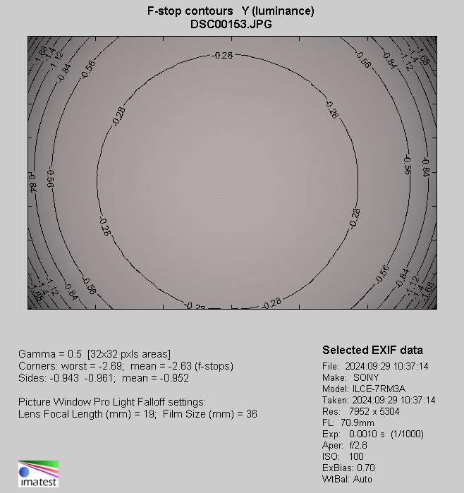 The maximum focal length shows slight increase of vignetting compared to the situation observed in the 50-70 mm range. By f/2.8 you deal with a level of 62% (-2.78 EV), by f/4.0 it is 43 % (-1.60 EV), and by f/5.6 we got 25% (-0.84 EV). Also at this point all problems end more or less by f/8.0 and f/11.0, where we got the following results: 13% (-0.40 EV) and 11% (-0.32 EV).