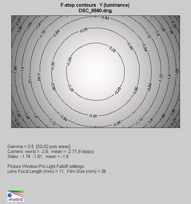 On JPEG files at the maximum relative aperture you have to take into account the loss of light in frame corners reaching as much as 58% (-2.51 EV). That value decreases to 39% (-1.41 EV) on stopping down the aperture to f/2.0 and to 32% (-1.11 EV), after applying the f/2.8 relative aperture.