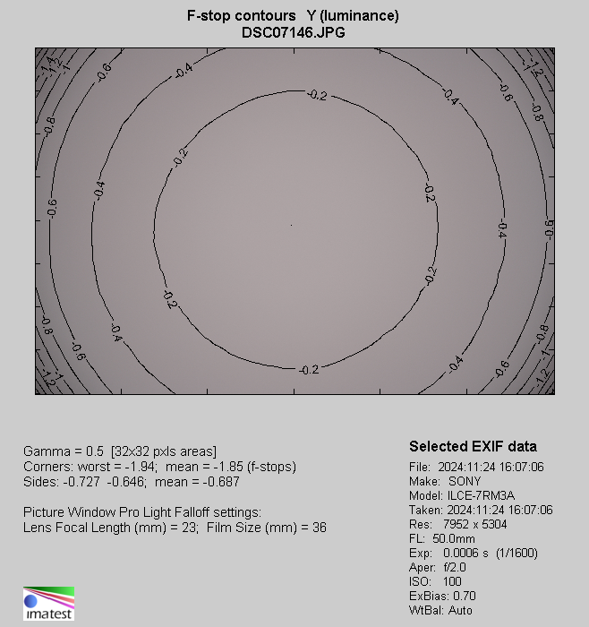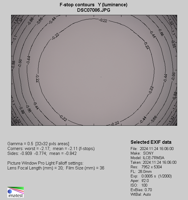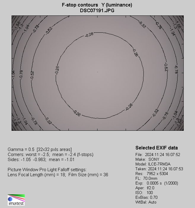 To be honest, knowing the parameters of the tested lens and the fact that the constructors tried their best to decrease its weight and dimensions in order to produce something smaller and lighter than the rival Canon model, I expected that vignetting at the maximum relative aperture would reach without any problems 3 EV or even higher.
