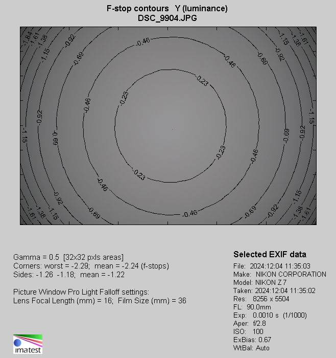 At the maximum relative aperture vignetting is slight but noticeable, reaching 22% (−0.70 EV). Fortunately by f/4.0 and f/5.6 this aberration decreases to a completely imperceptible level of, respectively, 5% (−0.15 EV) and 1% (−0.03 EV).