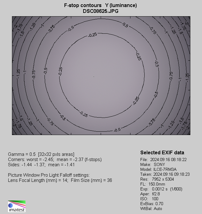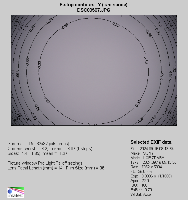 At the 35 mm focal length you see the return of a bit higher level but it's nothing surprising because at that point you also deal with the best aperture fastness. By f/2.0 the light fall-off in frame corners amounts to 18% (-0.58 EV) and it decreases to an imperceptible level of 5% (-0.14 EV) on stopping down the aperture to f/2.8.
