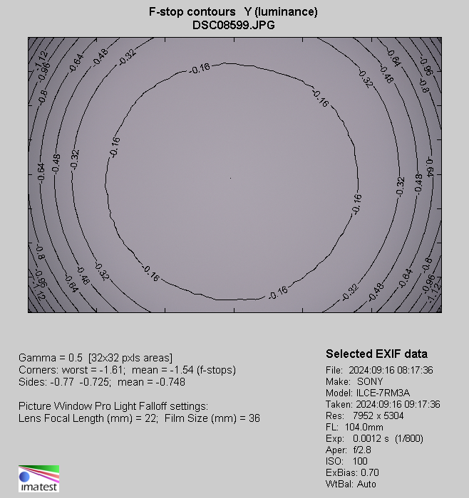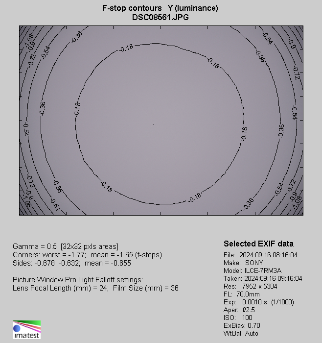 Very similar vignetting values you see at the 70 mm focal length where, even at the maximum relative aperture, they remain difficult to perceive, reaching just 9% (-0.28 EV) and decreasing to 7% (-0.20 EV) on slight stopping down the aperture to f/2.8.