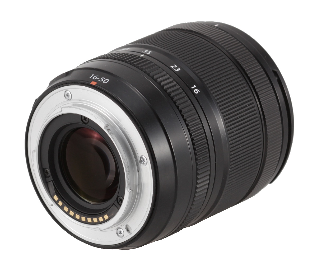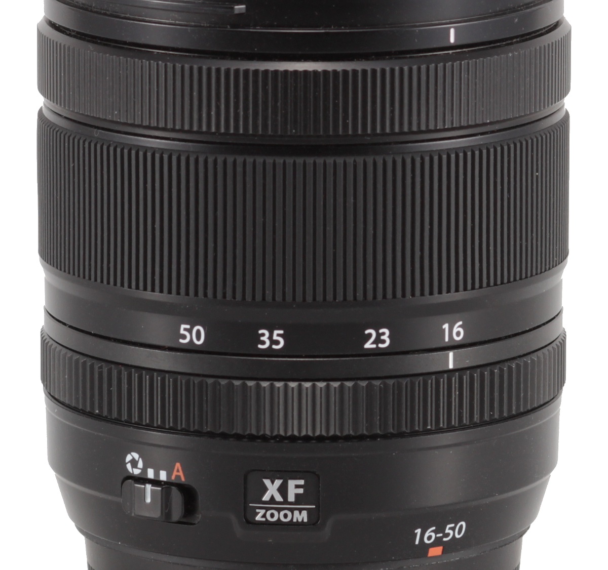 The proper casing starts with a little red square that makes an alignment with a camera easier, and '16-50' numbers. A bit further to the left you find a plate with an inscription 'XF ZOOM', and an aperture mode switch. Then you see an inscription 'Weather resistant', the serial number and information that the lens was manufactured in the Philippines.