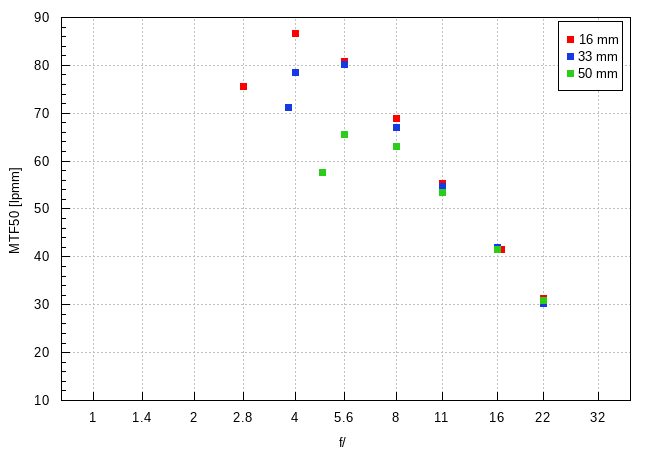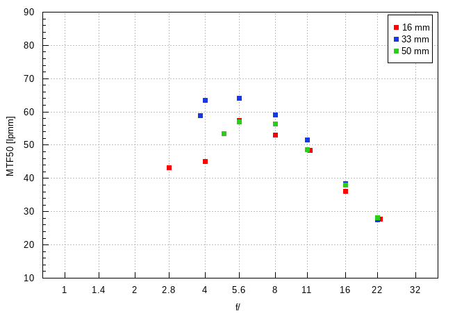 Now let's check how the tested Fujinon XF 16-50 mm f/2.8-4.8 R LM WR presents here.Its results in the frame centre at 16, 33, and 50 mm presents a graph shown below.