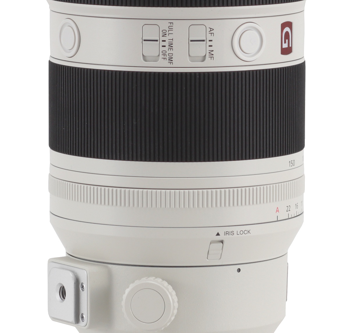 Then you see an immoble, white ring with the red G Master badge, meaning the series the tested lens belongs to, and three round focus lock buttons. Between them you get also switches that allow you to control the focusing mechanism mode AF/MF and the manual settings rings FULL TIME DMF ON/OFF.
