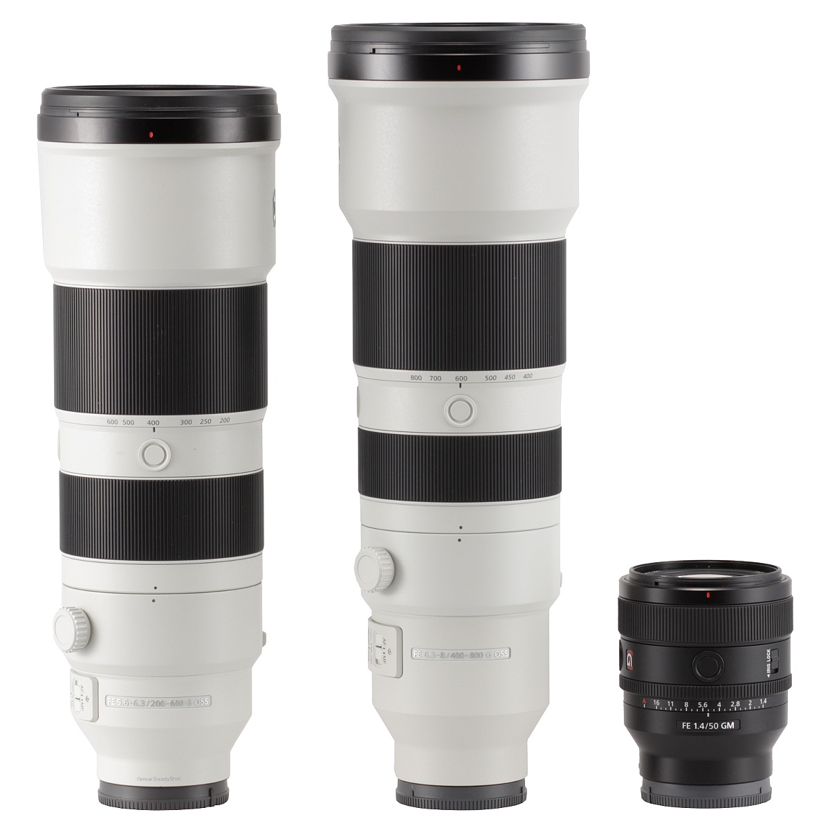 In the photo below the Sony FE 400-800 mm f/6.3-8 G OSS is positioned between the Sony FE 200-600 mm f/5.6-6.3 G OSS and the Sony FE 50 mm f/1.4 GM.