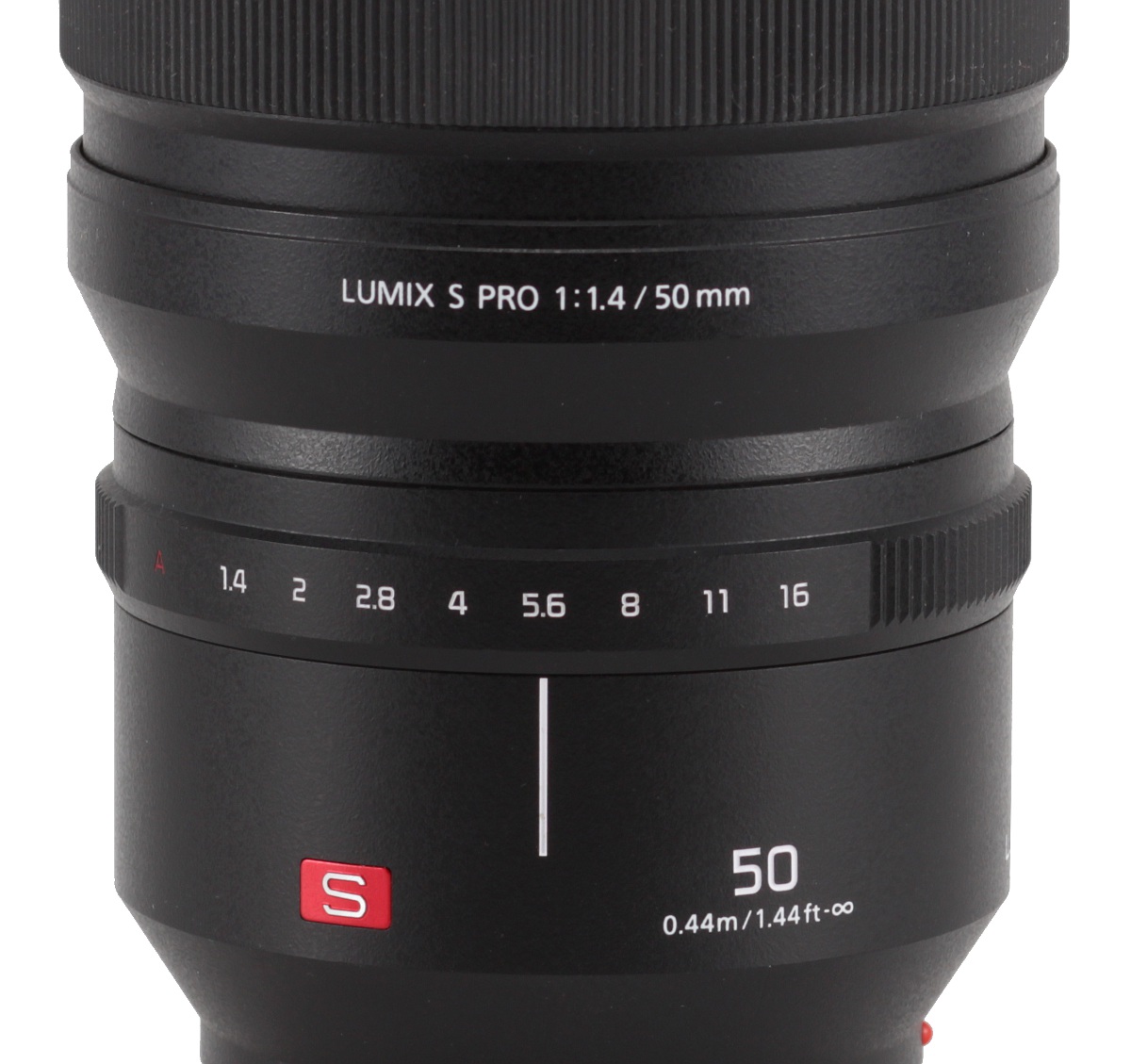 The proper barrel of the lens is made of metal covered by black paint. A red dot, making an alignment with the camera easier, is one of the first features. Further on the lens increases its diameter. On this already enlargened part, looking from above, there is a white vertical line – on its left there is the capital 'S' inside a red square (it means the lens belongs to the Pro series) on its right '50' meaning the focal length and the focusing range '0.44m/1.44ft-∞'.