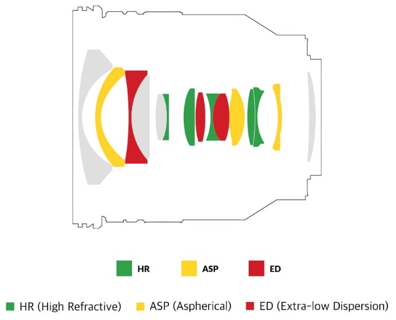 When it comes to the optical construction you deal here with 15 elements positioned in 11 groups.The producers weren't skimpy when it comes to special glass – you deal here with three low dispersion ED glass elements , three aspherical ones, and as many as five elements made of glass with high refractive index (HR). Inside the construction there is also a round aperture with nine blades that can be closed down to a value of f/22.