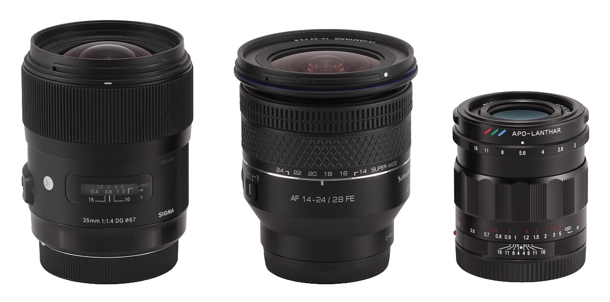 In the following photo the Samyang AF 14-24 mm f/2.8 FE is positioned between the reflex camera Sigma A 35 mm f/1.4 DG HSM and the Sony FE version of the Voigtlander Apo-Lanthar 2/50.
