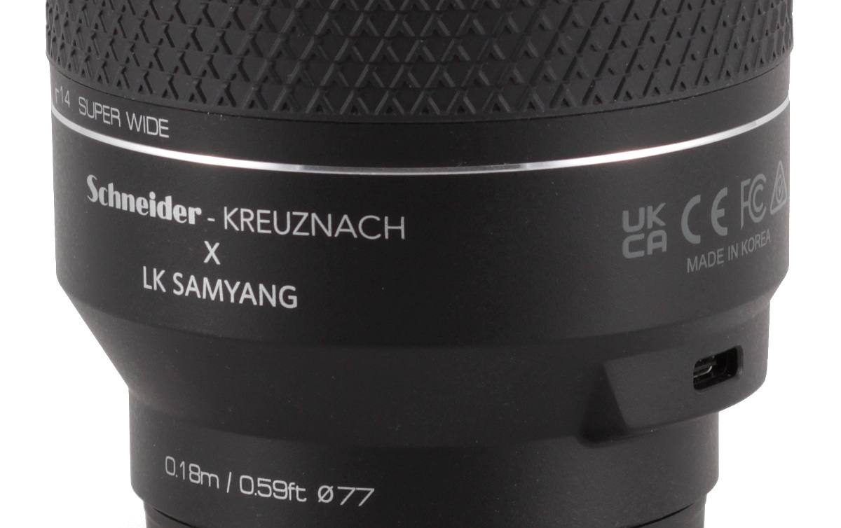 The ring increases its diameter very quickly and on that already enlargened part you see an inscription with the name and parameters of the lens. Looking from above, on the right side, there are logotypes of the producers, Schneider-Kreuznach and LK Samyang; on the left you find the AM/MF switch and a programmable FOCUS LOCK button. In the back there is another piece of information concerning the place of production and an unprotected USB port that is used to lens software upgrades.