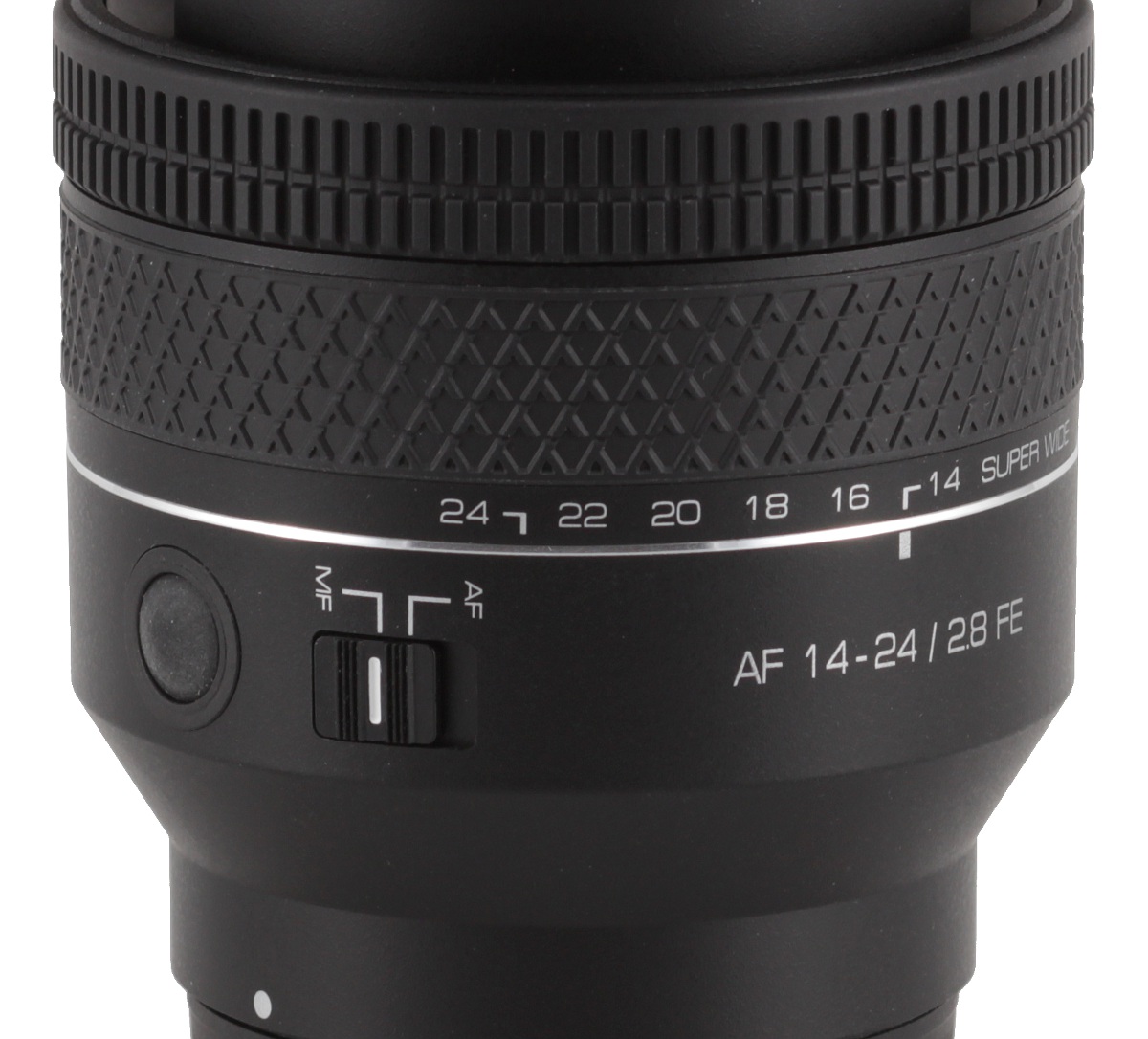 A zoom ring, as wide as 21 mm, is another part of the lens. It is equipped with comfortable ribbing and also focal length markings at 14, 16, 18, 20, 22, and 24 mm. It moves quite smoothly and is properly damped.