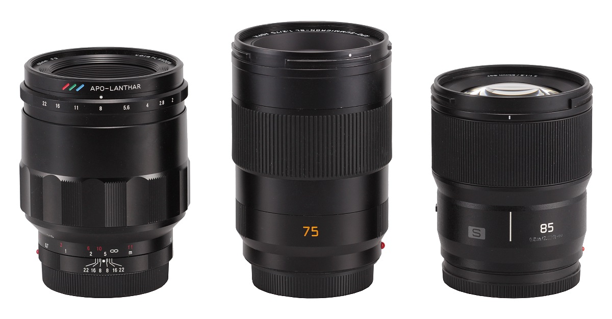 In the following photo the Leica APO-Summicron-SL 75 mm f/2 ASPH. is positioned between the aforementioned Voigtlander 2/65 and the L mount version of the Panasonic S 85 mm f/1.8.